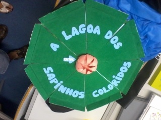 Ele foi elaborado por um grupo de quatro pessoas e foi feito de modo totalmente manual (escrita, desenhos e capa). Quando começamos a pensar no livro (que foi a parte mais difícil), dois integrantes do grupo escreveram uma história, mas preferimos fazer o livro a partir da história que o eu escrevi: “A lagoa dos sapinhos coloridos”. Essa história foi escolhida pela linguagem simples, mas a nosso ver, cativante e propícia para a idade etária que estávamos pensando em trabalhar.