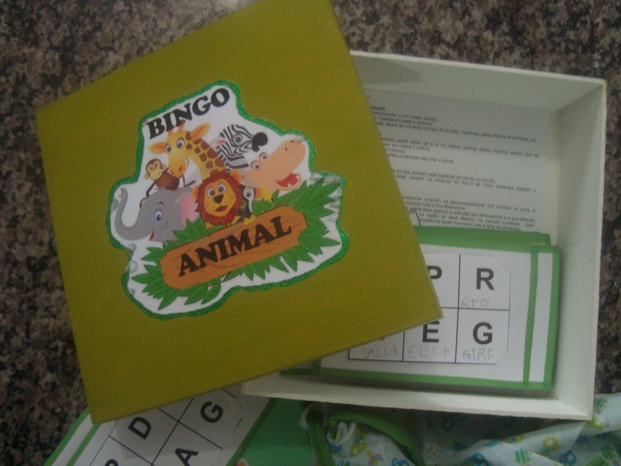 O instrutor deverá entregar para cada jogador uma cartela do bingo e já encaixada a esta cartela, a outra com 6 letras diferentes. Depois ele tirará do saco uma imagem de um animal e falará seu nome. Os participantes deverão tentar identificar qual é a letra inicial do animal sorteado e verificar se a mesma tem em sua cartela. Havendo a letra, ela deverá escrever o nome do animal dentro do quadrado que correspondente a letra inicial do nome do animal sorteado.